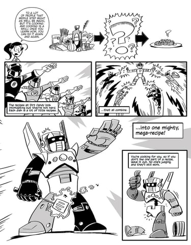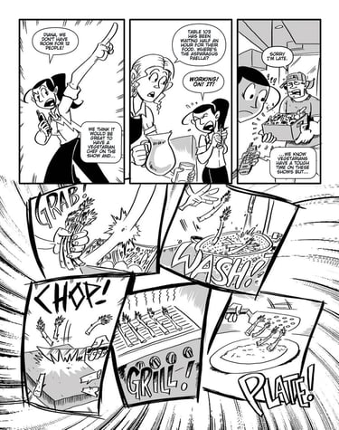 It was a joy and a privilege to collaborate with chef Amanda Cohen (James Beard award-nominated chef, restauranteur and Iron Chef Canada cast member) on her first cookbook. Teaming up with writer Grady Hendix, we translated Amanda's recipes, anecdotes and personal philosophies into a unique hybrid cookbook and comic book memoir that we're all very proud of. The recipes are super tasty and it's really funny too! Published by Clarkson/Potter in 2012, Dirt Candy: A Cookbook is now in its 8th printing (with no signs of slowing down) and available in bookstores everywhere. Since the publication of the cookbook I've continued to work with Amanda and Dirt Candy, producing illustrations for signage, promotion and catered events.